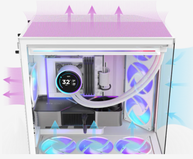 Το H9 Flow είναι ένα ευρύχωρο κουτί ATX μεσαίου μεγέθους, κατασκευασμένο για κατασκευές υψηλής απόδοσης, εξισορροπώντας τη ροή του αέρα και την αισθητική. Ο σχεδιασμός διπλού θαλάμου βελτιώνει την ψύξη και τη διαχείριση των καλωδίων, ενώ τα διάτρητα πάνελ, οι γωνιακοί ανεμιστήρες και η άφθονη υποστήριξη ανεμιστήρων και ψυγείων προσφέρουν βέλτιστη θερμική απόδοση.
