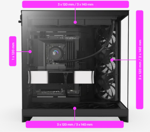 - Χωρητικότητα δέκα ανεμιστήρων: Υποστηρίζει έως και εννέα ανεμιστήρες 140 mm στο πάνω, μπροστά δεξιά και κάτω μέρος, καθώς και έναν ανεμιστήρα 120 mm στο πίσω μέρος.