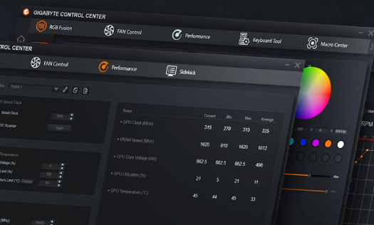 Η οθόνη LCD δεν εμφανίζει μόνο πληροφορίες για την κάρτα γραφικών, αλλά και διάφορα αγαπημένα κείμενα, φωτογραφίες και GIF. Μπορείτε επίσης να προσαρμόσετε τα εφέ φωτισμού μέσω του GIGABYTE CONTROL CENTER.