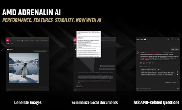 Οι νέες κάρτες γραφικών συνοδεύονται από το AMD Adrenalin AI. Πρόκειται για μία τοπικά επιταχυνόμενη εφαρμογή δημιουργικής (ή παραγωγικής AI) που μπορεί να παράγει εικόνες, να συνοψίζει έγγραφα και να εκτελεί διάφορες γλωσσικές/γραμματικές εργασίες (όπως να μεταφράζει, να γράφει, να συνοψίζει κ.ά.). Επιπλέον, μπορεί να λειτουργεί ως chatbot για να απαντά σε διάφορα ερωτήματα που σχετίζονται με την AMD και τα προϊόντα της.